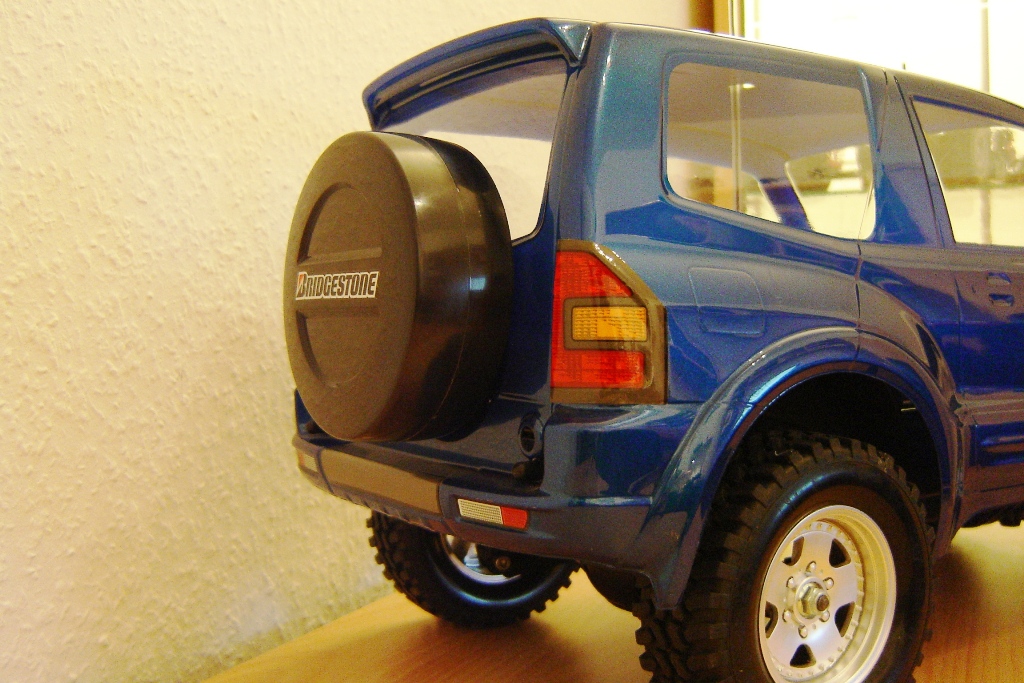 OK, gut ins neue Jahr angekommen ist auch ein Großteil der bestellten Teile da. Die Pajero Karosserie sieht um Welten besser aus, als der Touareg. Also ausschneiden, Abklebefolien für die Scheiben anfertigen und ab zum Lackieren. (Die hinteren Fenster wurden auch mit abgeklebt.) Hier sei darauf hingewiesen, daß bei Verwendung der Originalbefestigungspunkte hinten die Karosserie so tief sitzt, daß die Räder beim Einfedern im Radkasten schleifen. Also noch ein Loch tiefer bohren... (vorsichtig, dort ist das Lexan sehr dünn, ich habe zusätzlich von innen verstärkt...) Der Karosseriehalter vorn wurde durch einen vom TB- EVO III ersetzt, so kommt man dort auch höher. Die hintere Verstärkung von Modellanhänger ist sehr zu empfehlen- so braucht man keine Angst mehr vor den weichen Radkästen zu haben. Die Domstrebe vorn ist eher etwas zur Beruhigung des Gewissens...