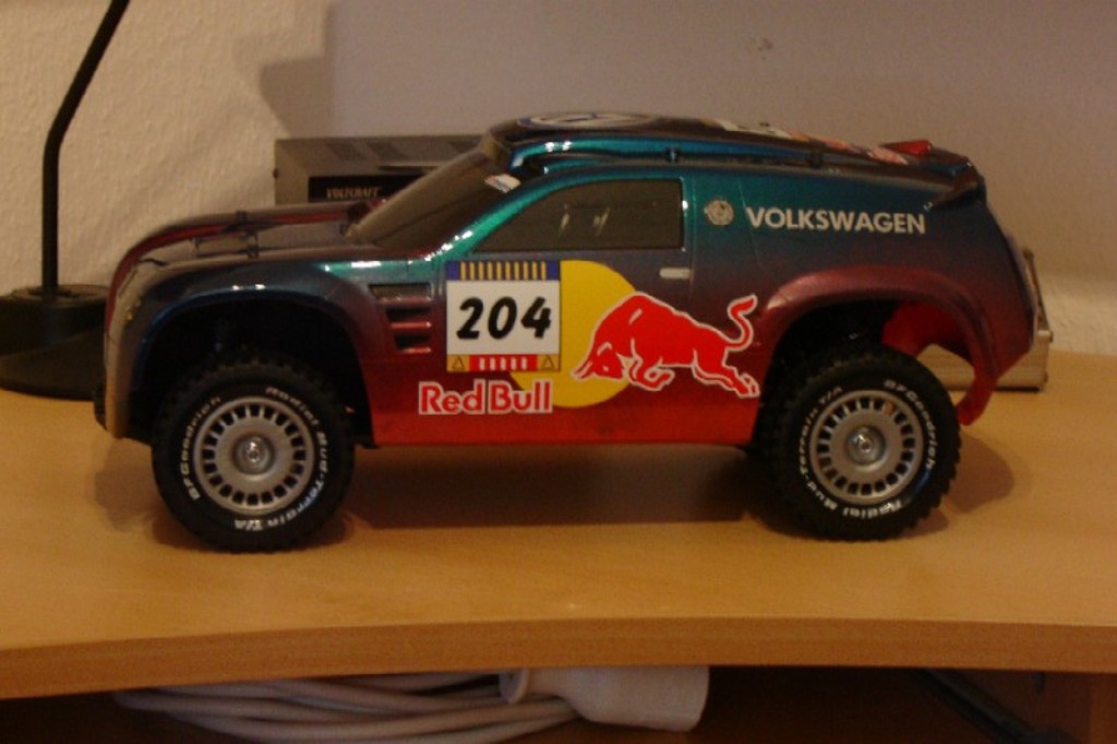 Hier sind einige Bilder von meinem Tamiya Race-Touareg auf XC-Basis zu sehen. Das Fahrzeug ist noch nicht ganz fertig. Die restlichen Teile (z.B. Lenkung von Bauteil1, Motor "Truck Puller II" von LRP) müssen noch hinein. Verbaut sind Bleiringe (4 x 190g) in den Rädern. Das hintere Differential wurde gesperrt.